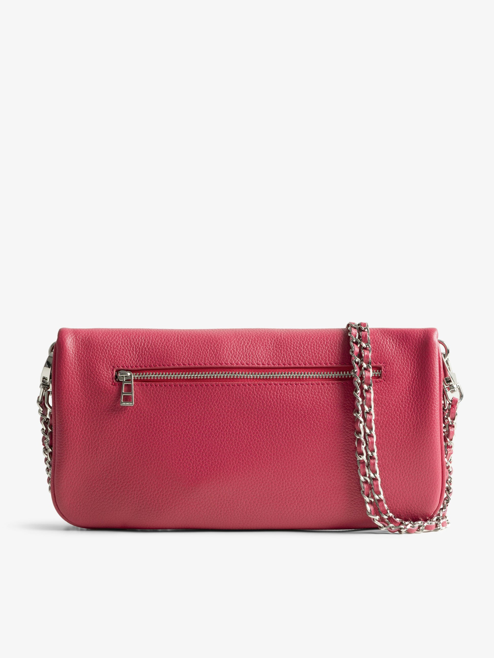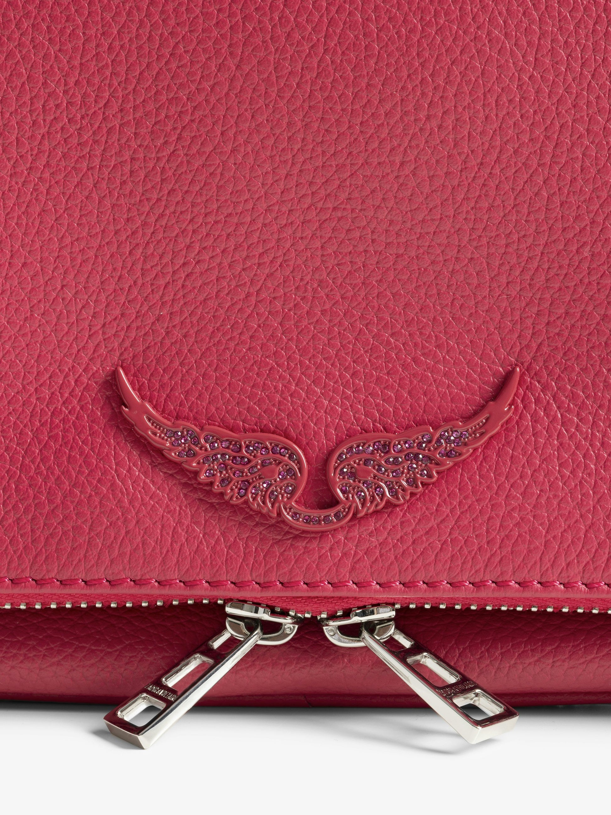 Bolso de mano de cuero granulado con doble cadena de cuero y metal y alas adornadas con strass.