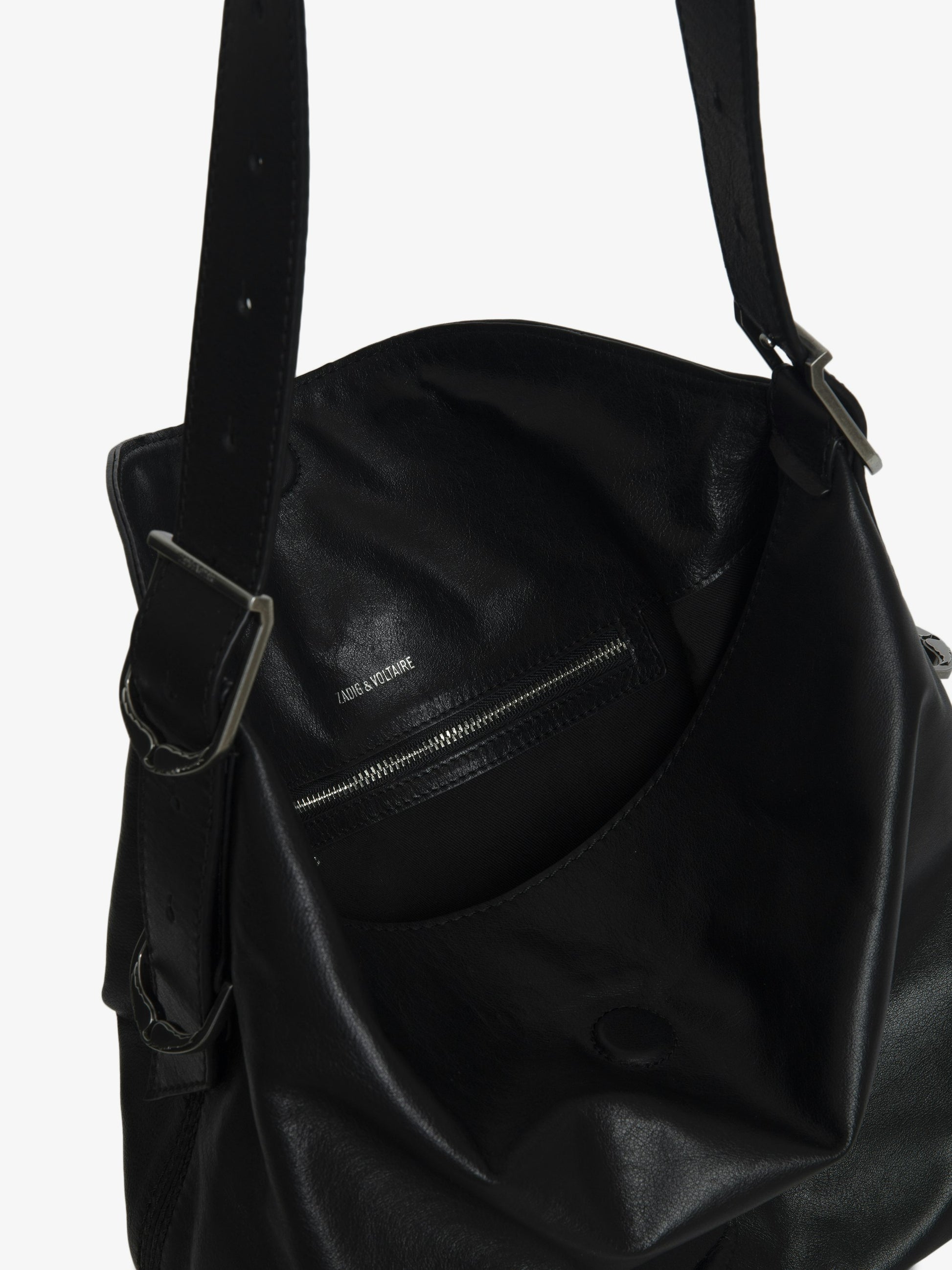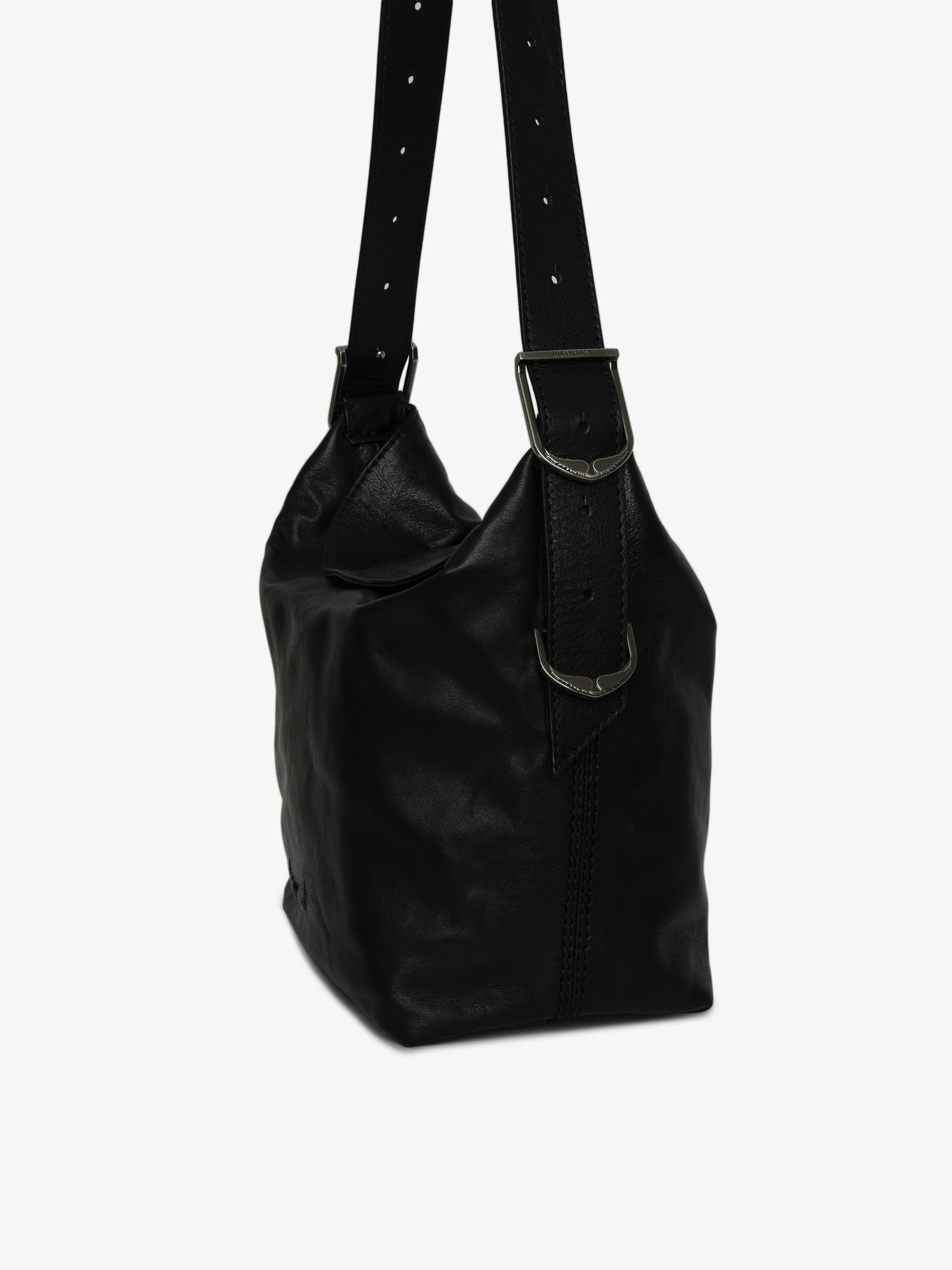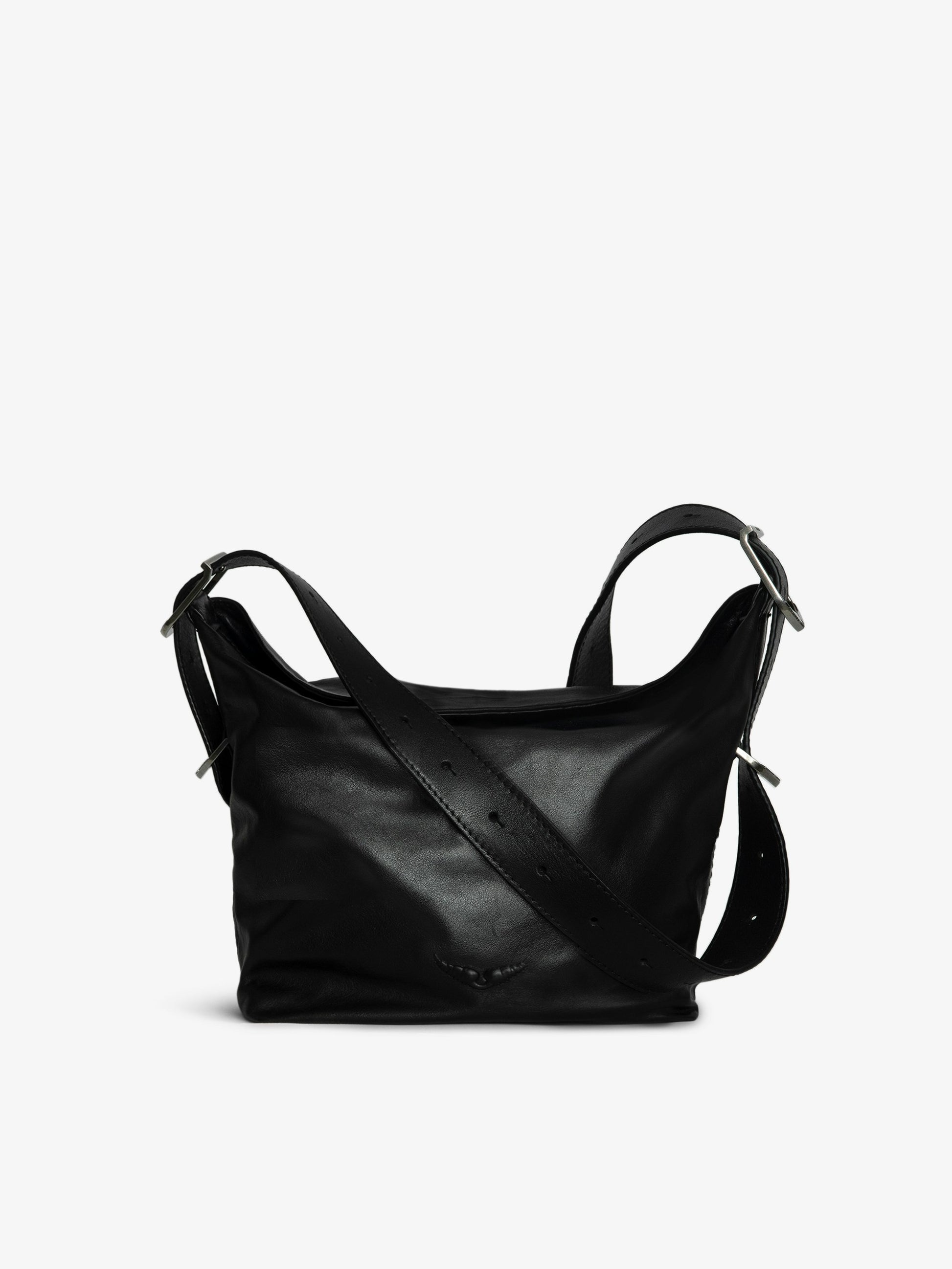 Bolso de piel con bandolera ajustable y firma de alas grabadas.