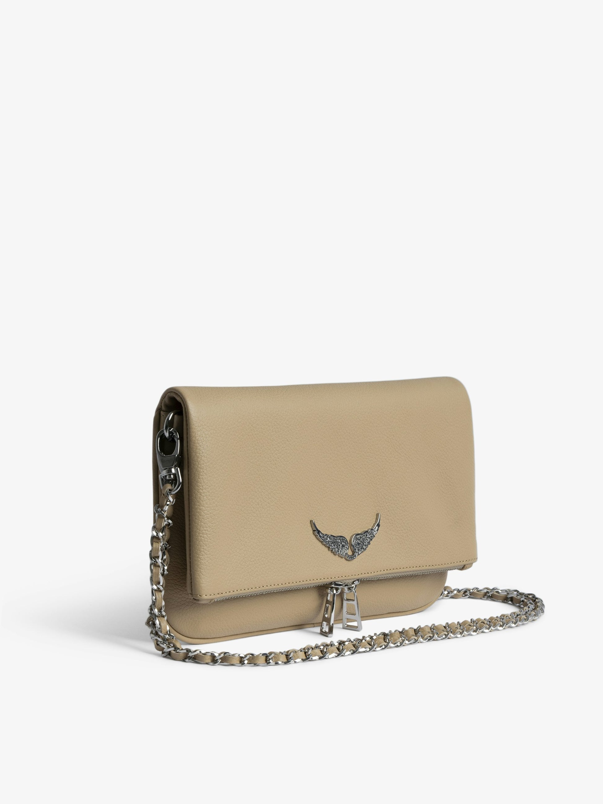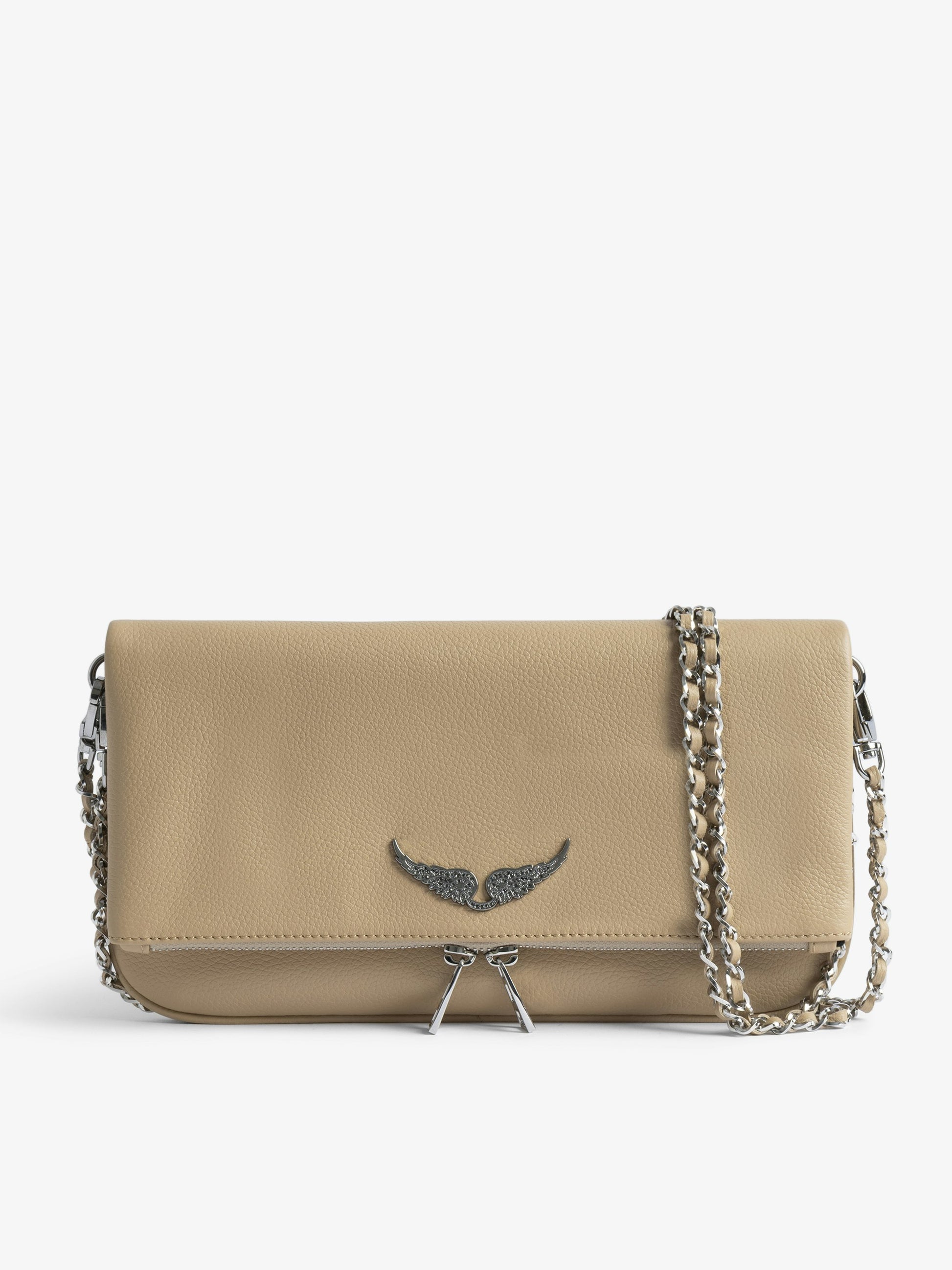 Bolso de mano de piel granulada con doble cadena de piel y metal y alas adornadas con pedrería.