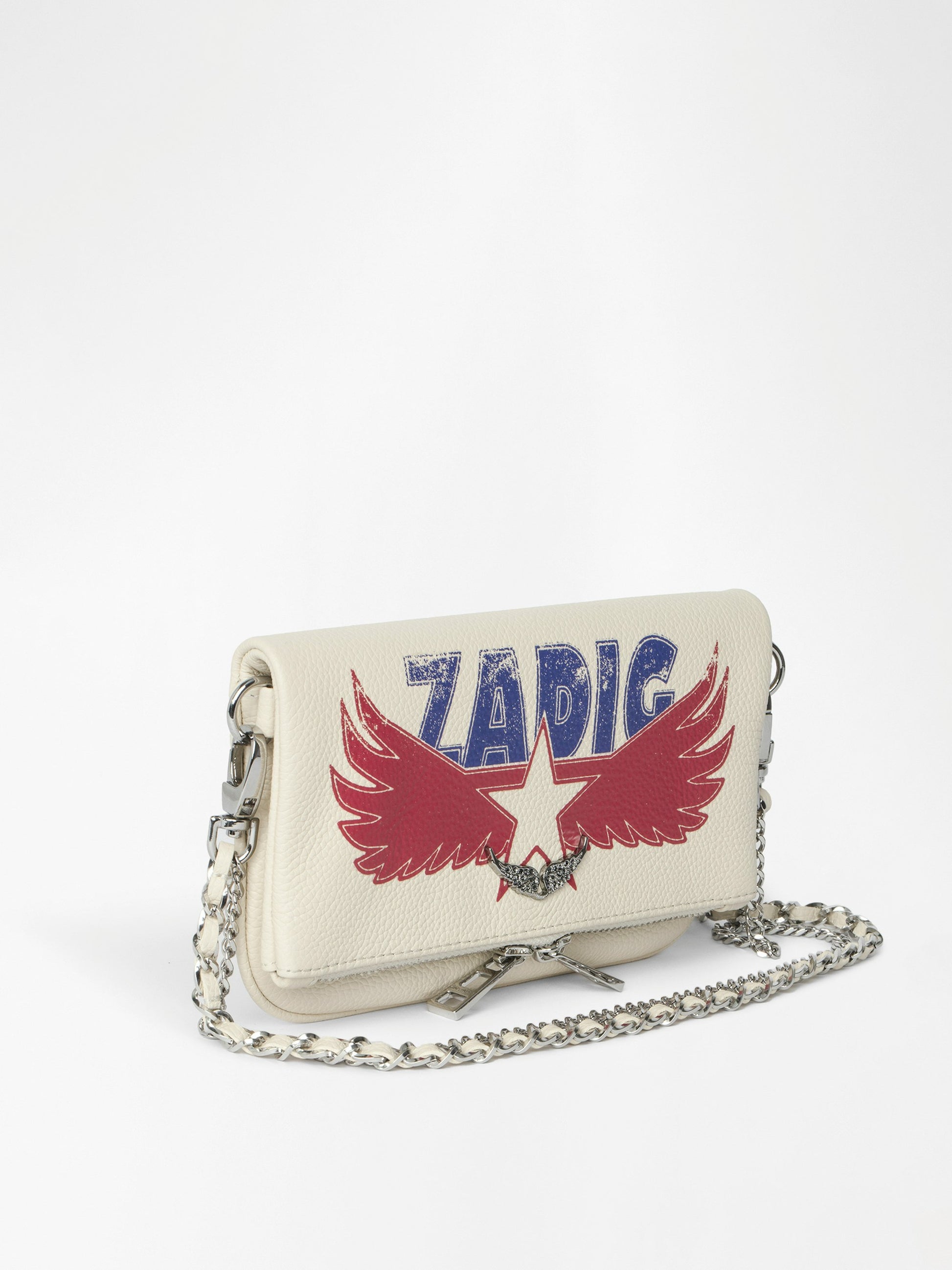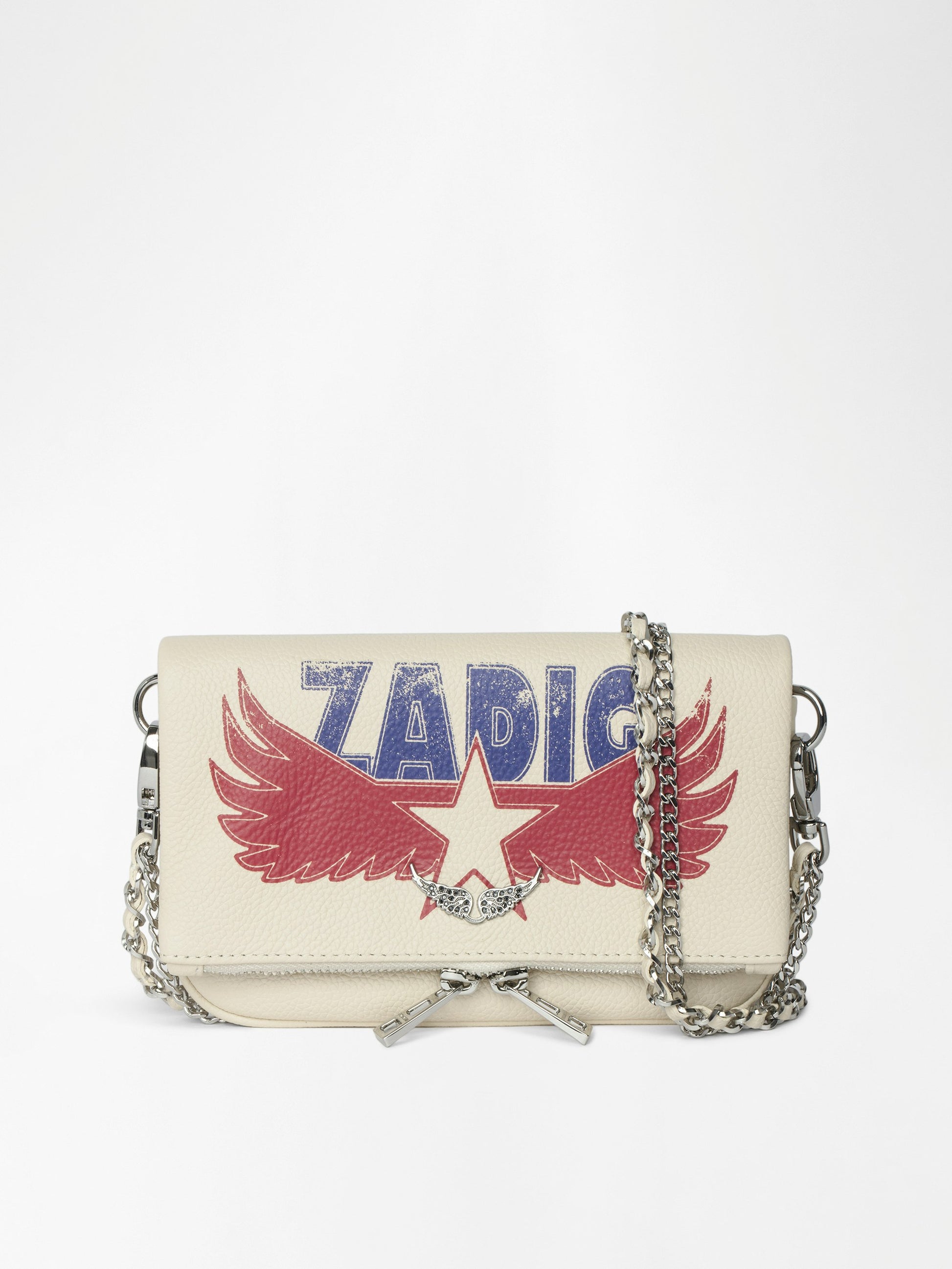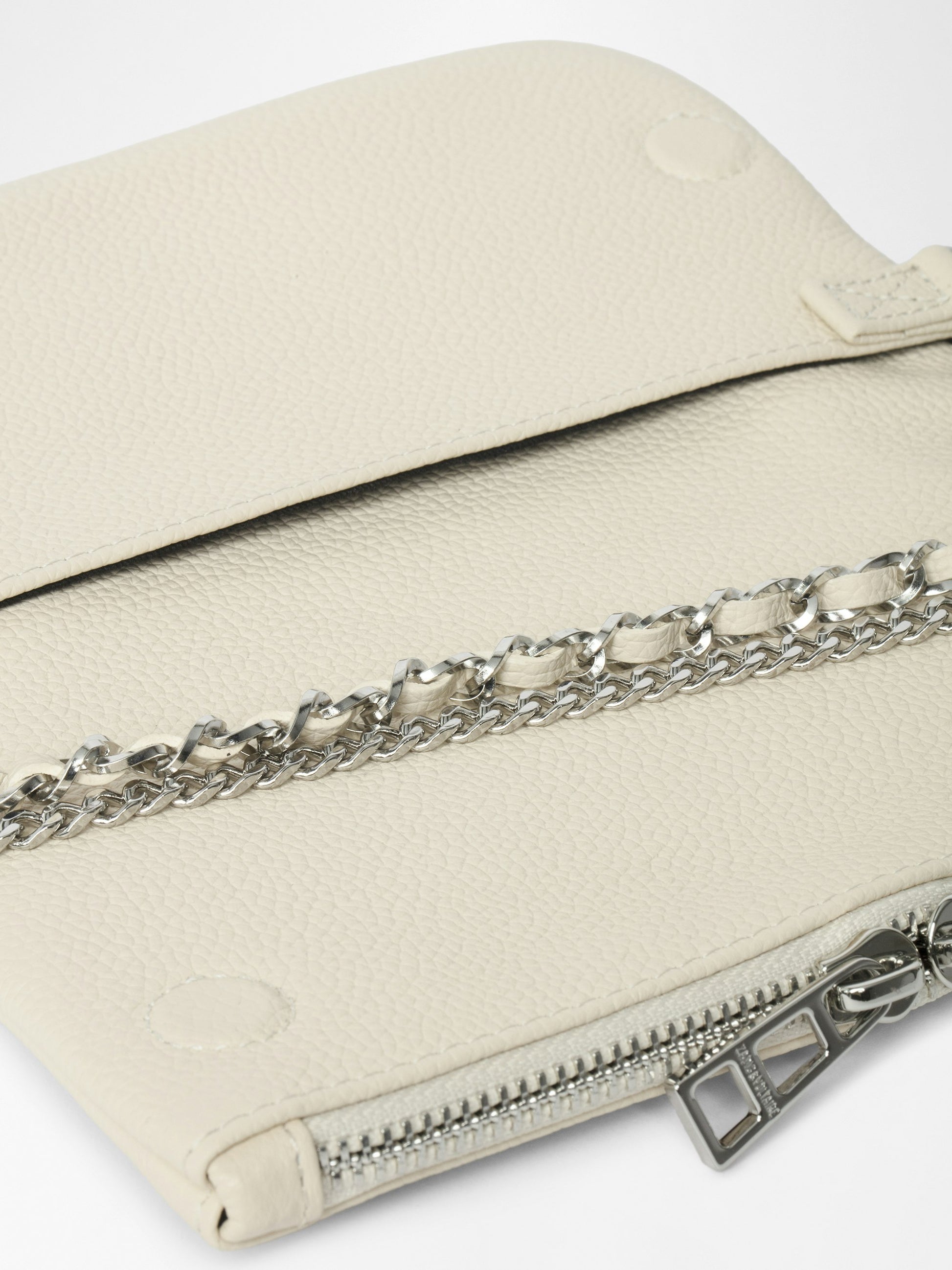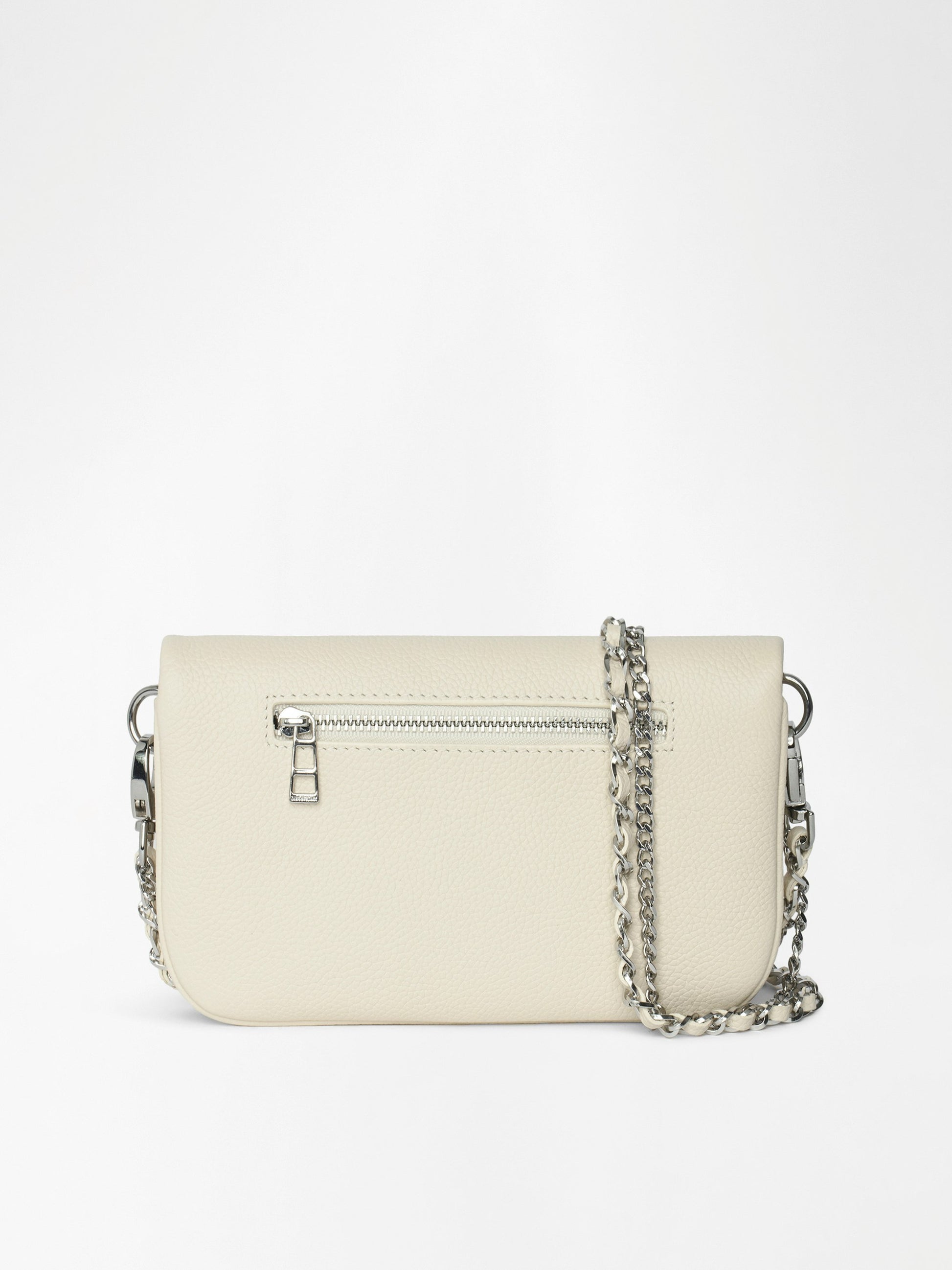 Bolso de mano de cuero granulado con doble cadena de cuero y metal y alas decoradas con strass.