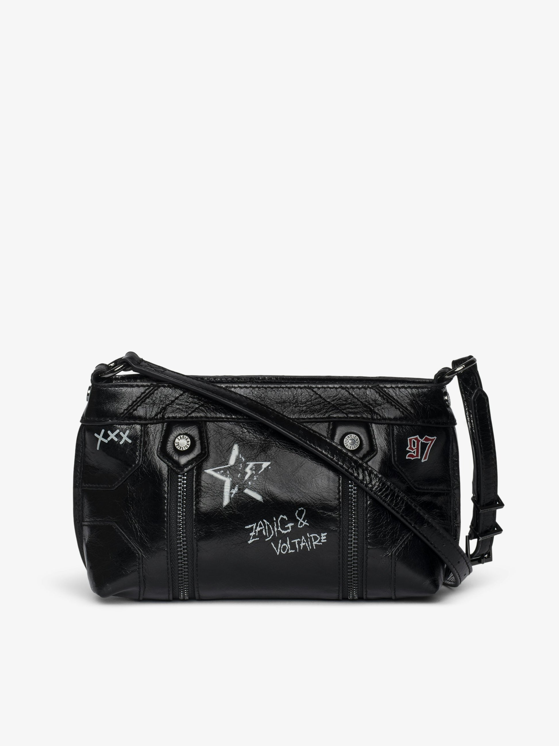 Pequeño bolso de cuero charolado de inspiración vintage con correa ajustable y firma de alas y etiqueta punk.