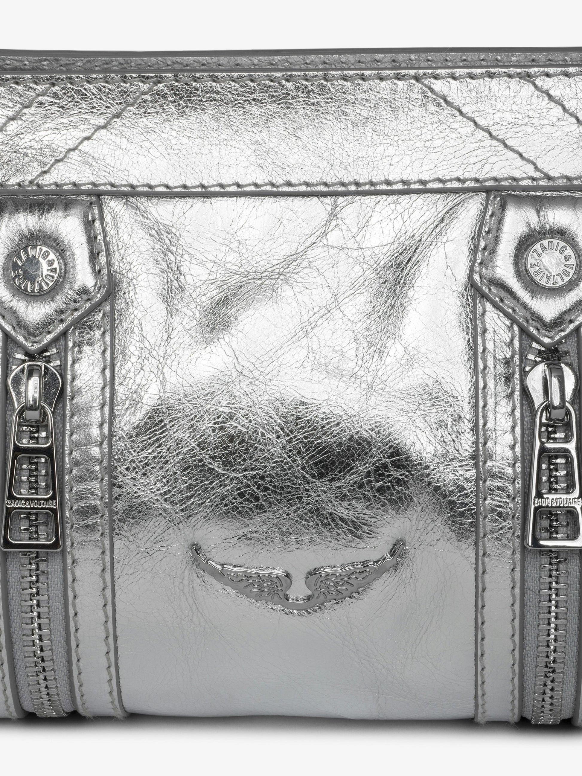 Pequeño bolso de cuero metalizado, con correa ajustable y firma de alas.