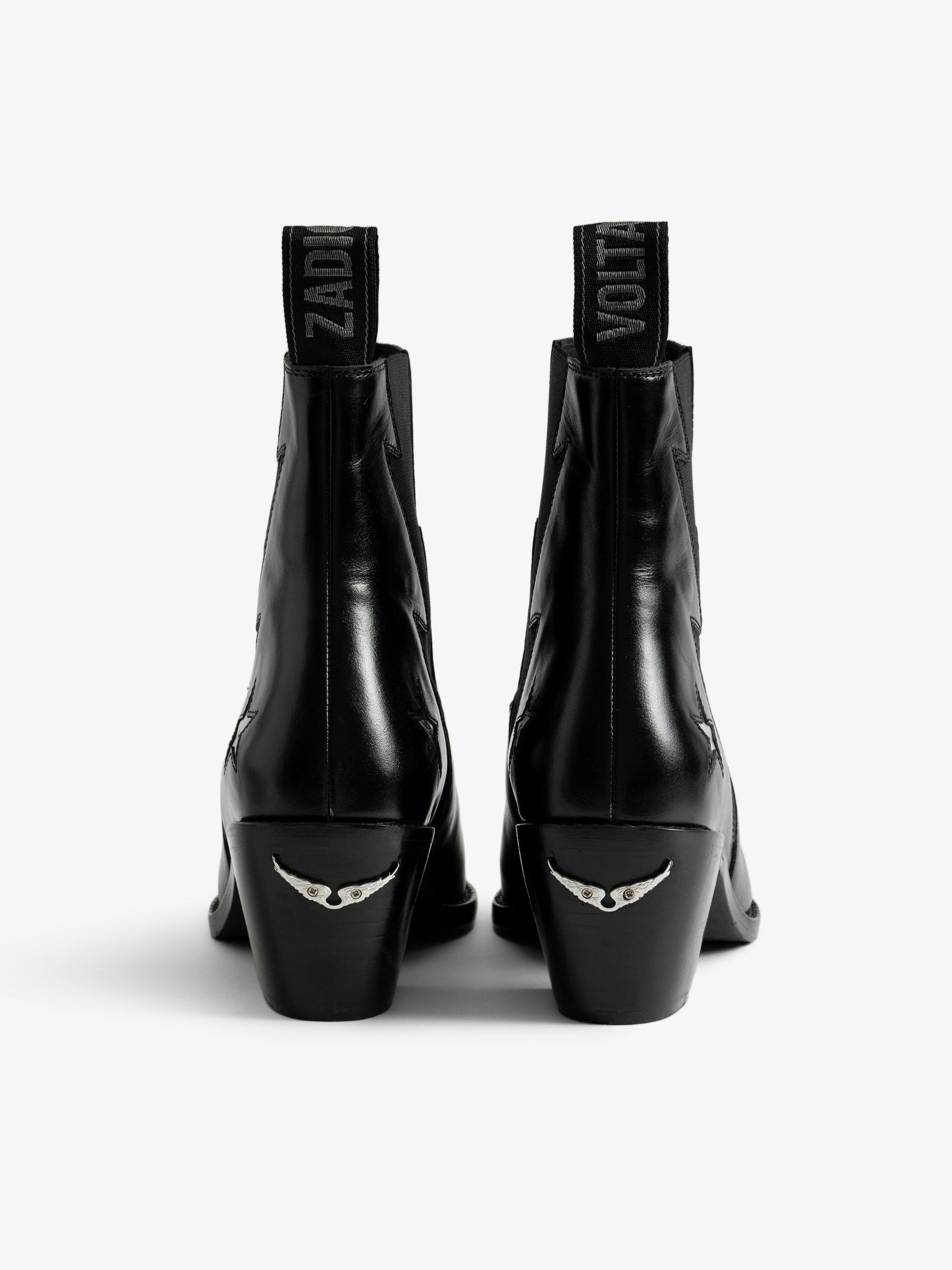 Botines de cuero con efecto vintage adornados con estrellas y un elástico en forma de rayo.