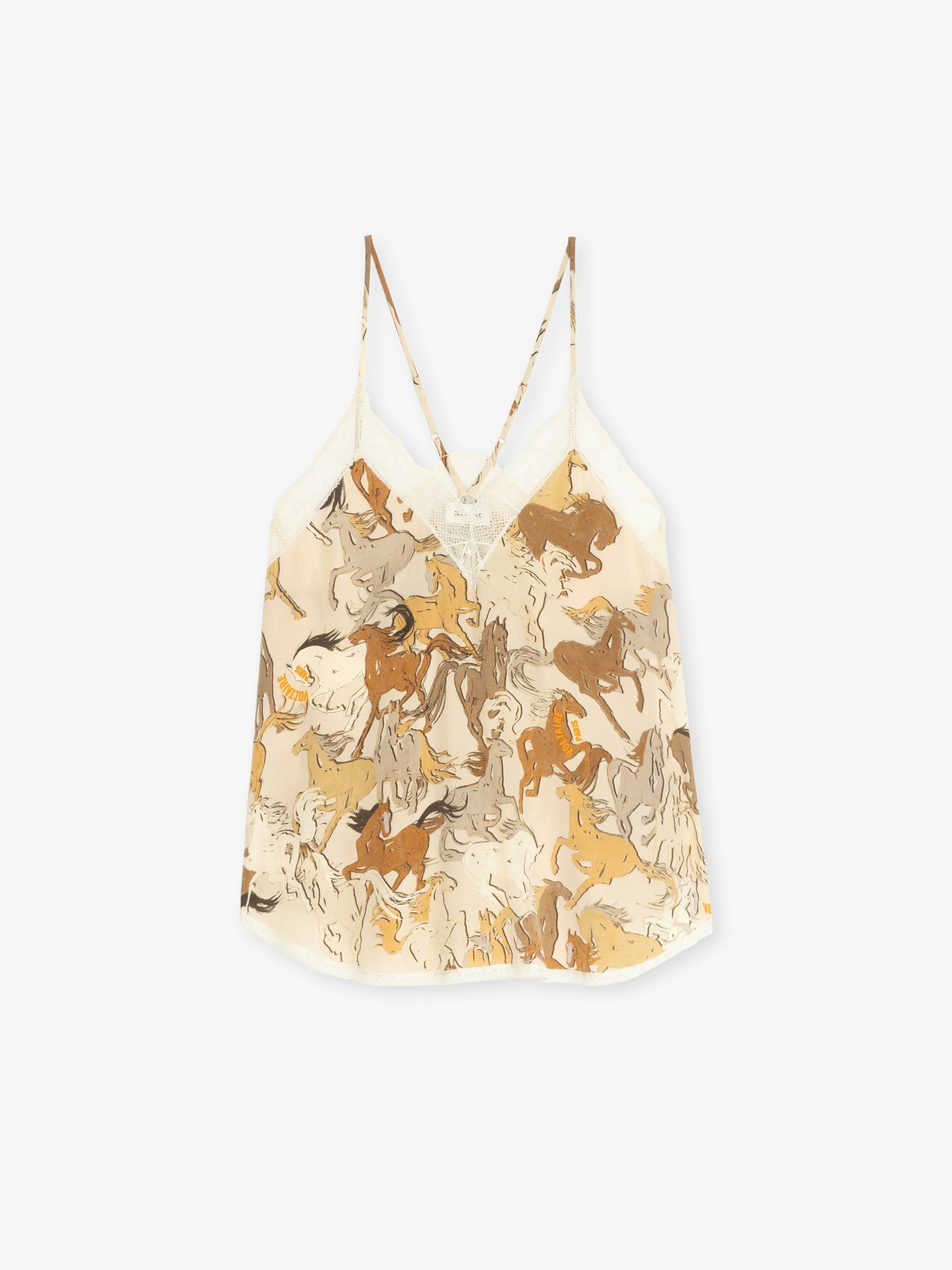 Top lencero en seda crepé de China estampado horses, tirantes ajustables, encaje francés y alas bordadas en la espalda.
