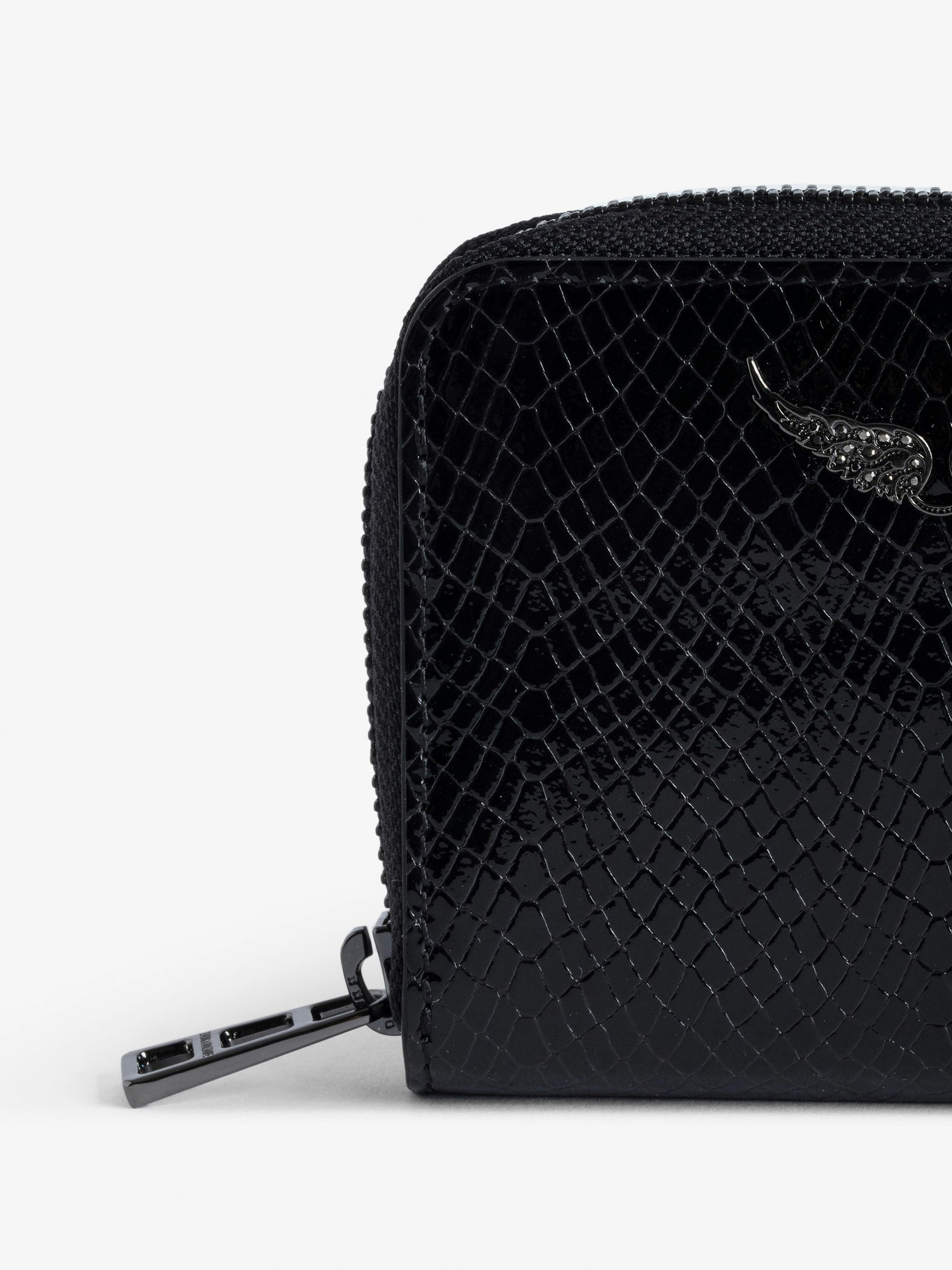 Cartera de piel brillante con efecto pitón adornada con un charm de alas con strass.