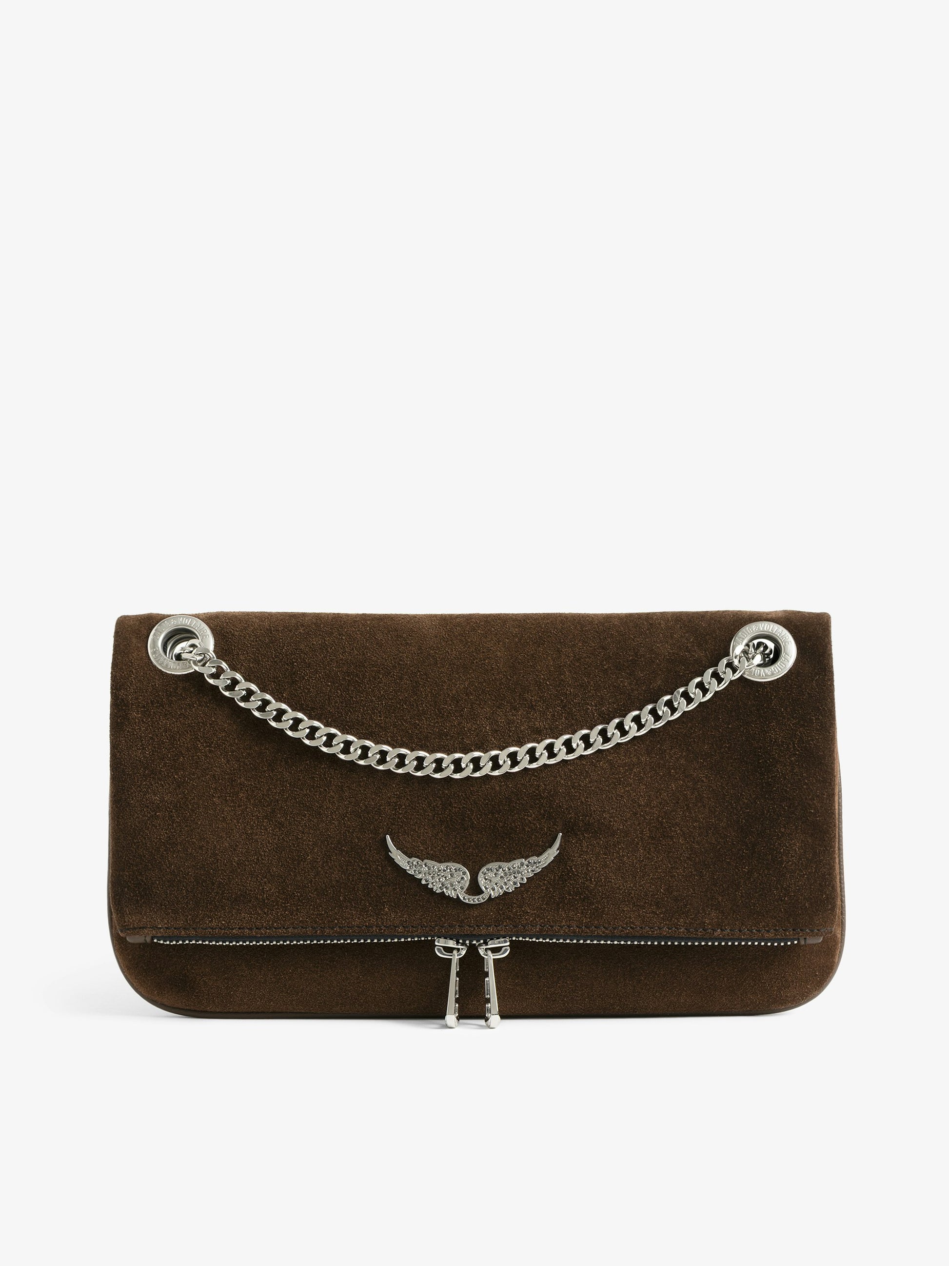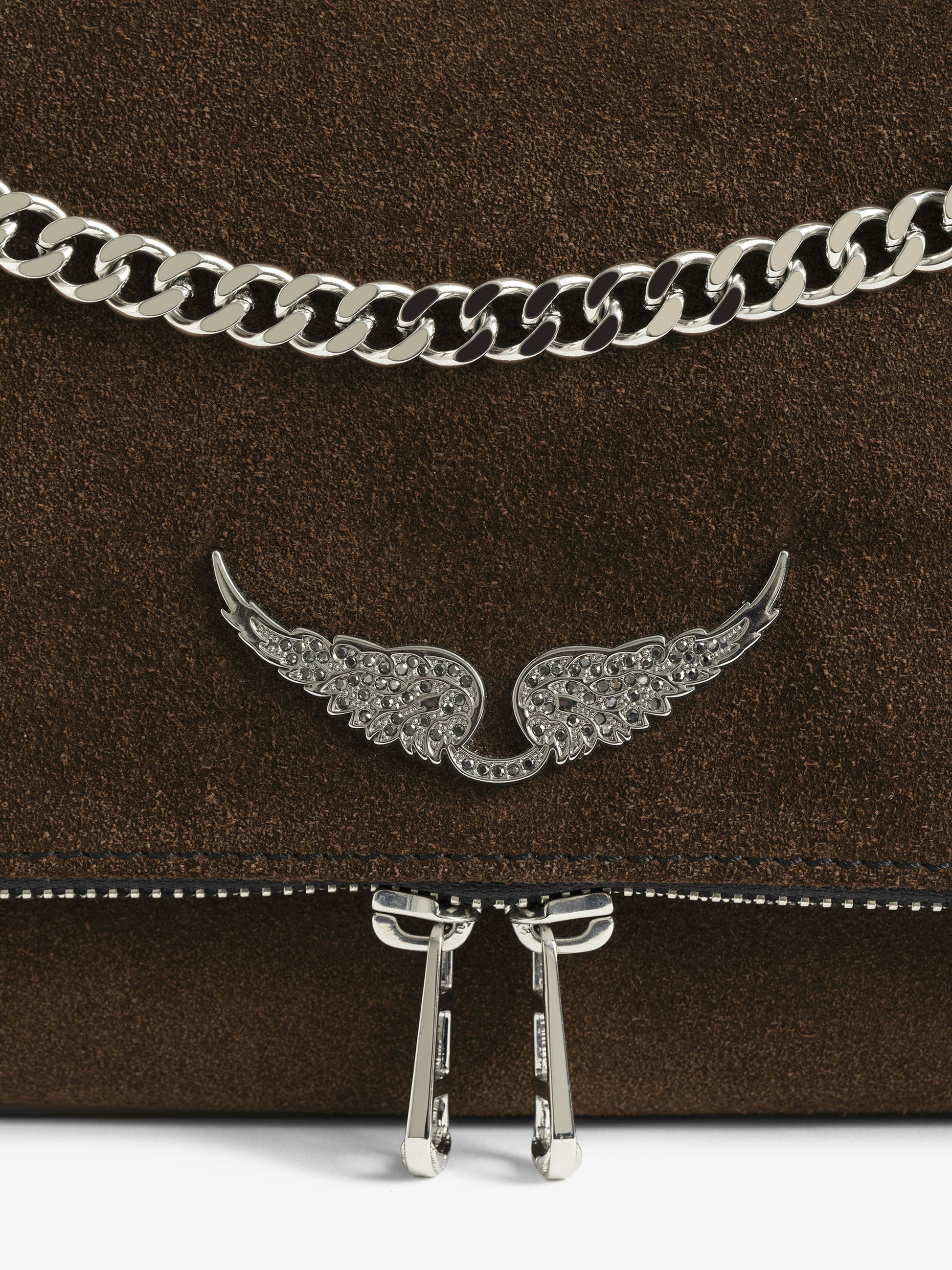 Bolso de mano de piel ante con cadena metálica deslizante y alas distintivas.