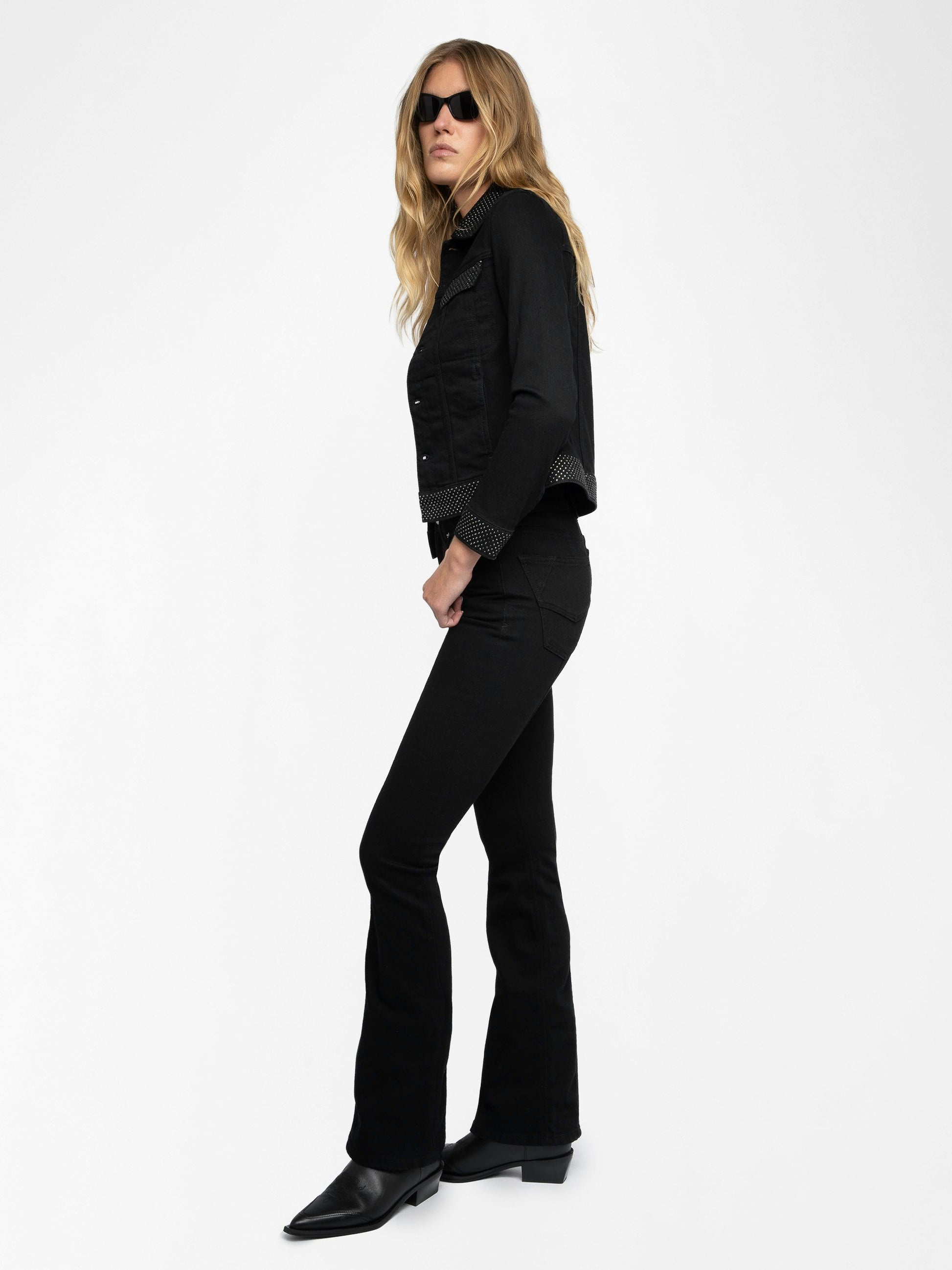 Chaqueta entallada de denim abotonada, con strass y múltiples bolsillos.