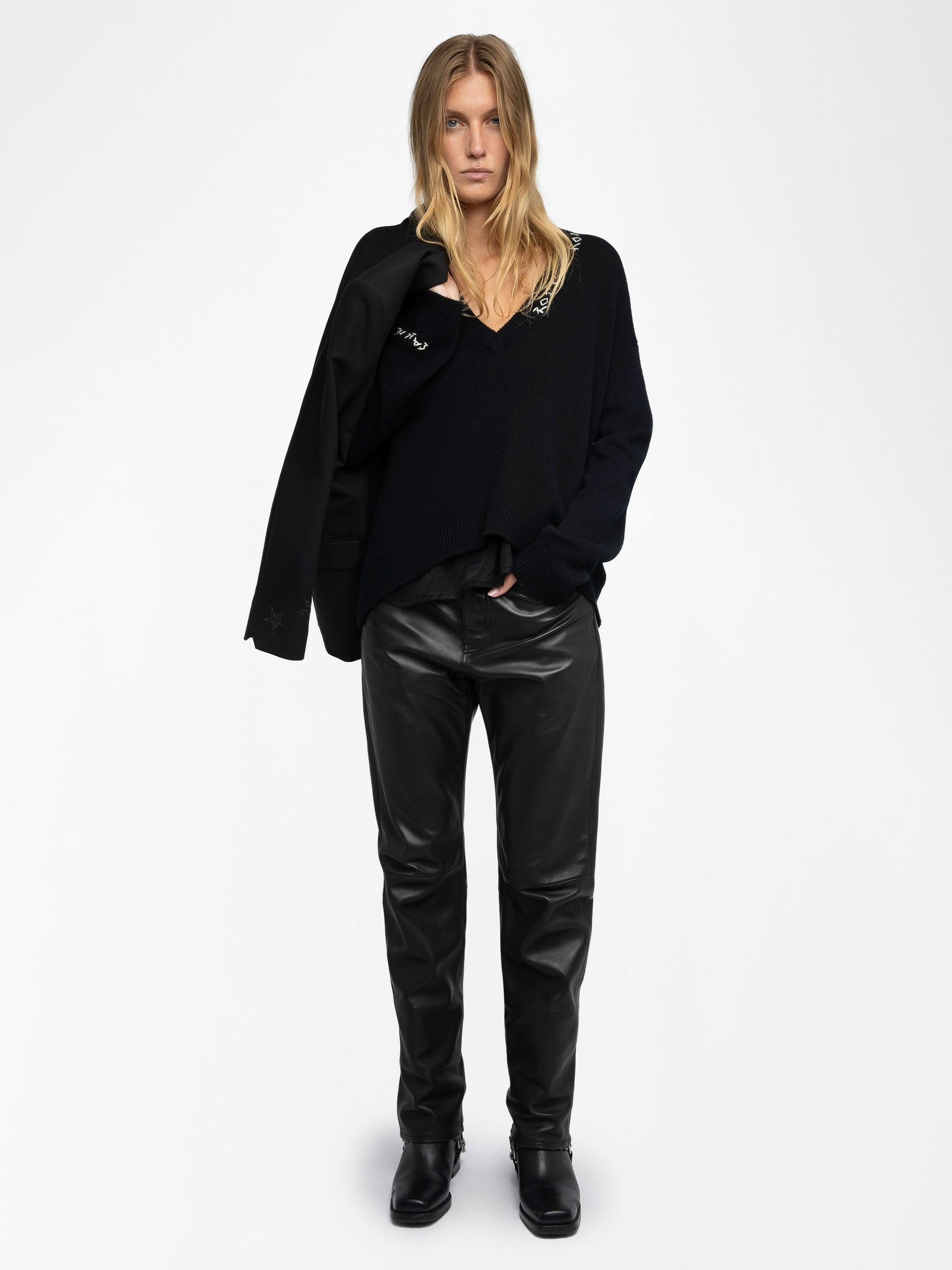 Jersey con cuello en V y mangas largas con bordado rock n roll en el escote.