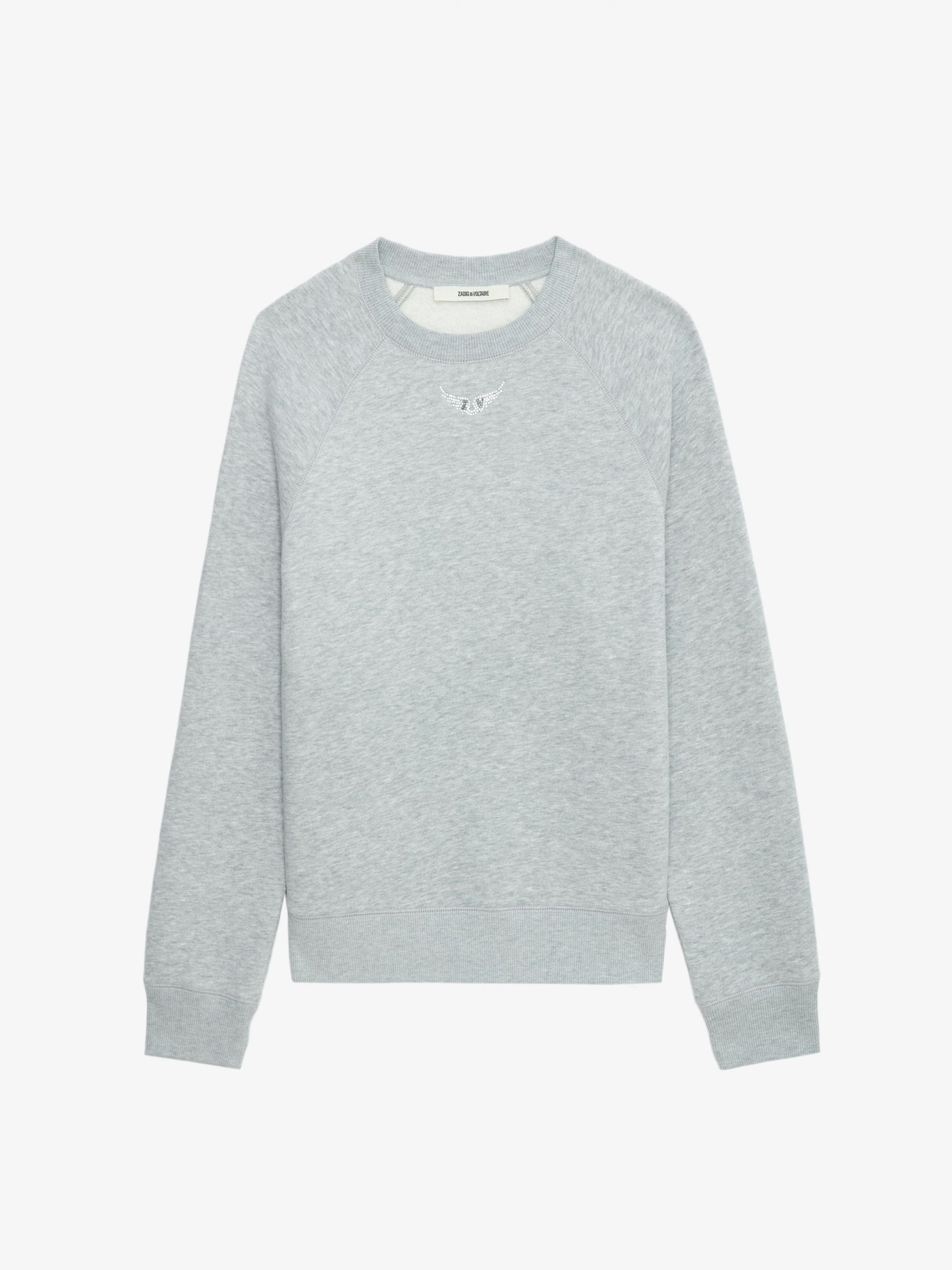 Sudadera de color gris jaspeado claro de manga larga, con alas ZV y strass en la parte delantera.